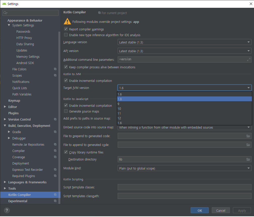 해결책은 설정 창을 열어서 코틀린 컴파일러에서 사용하는 JVM 버전을 1.6 에서 1.8로 변경하면 된다.