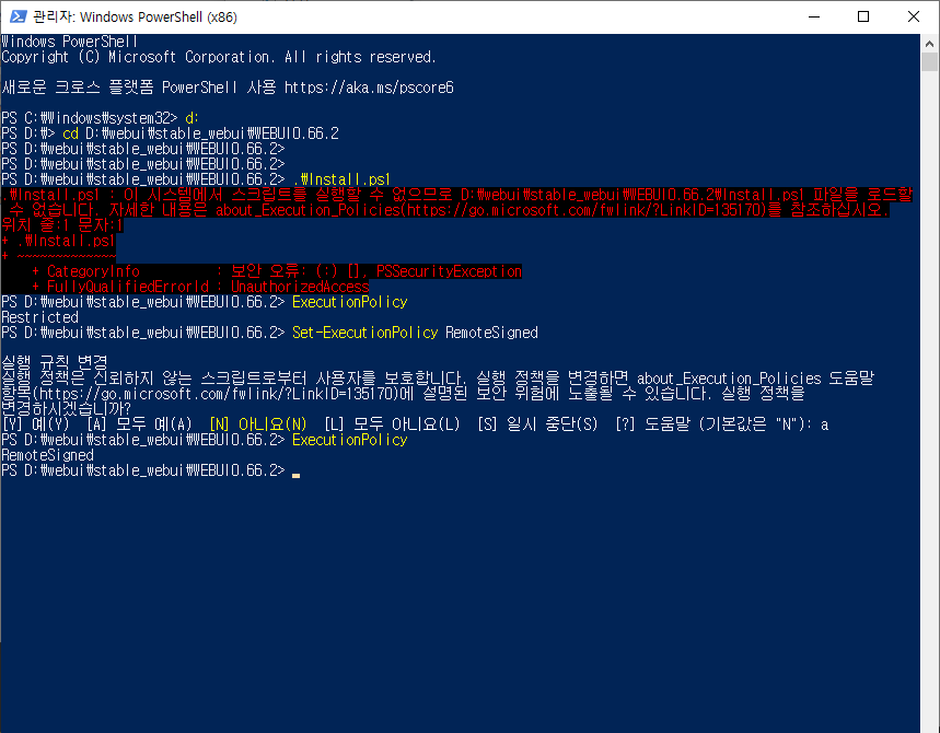 이번에 집 pc 에도 webui 환경을 설치하기 위해 powershell 에서 ps1 스크립트를 실행하려 하자