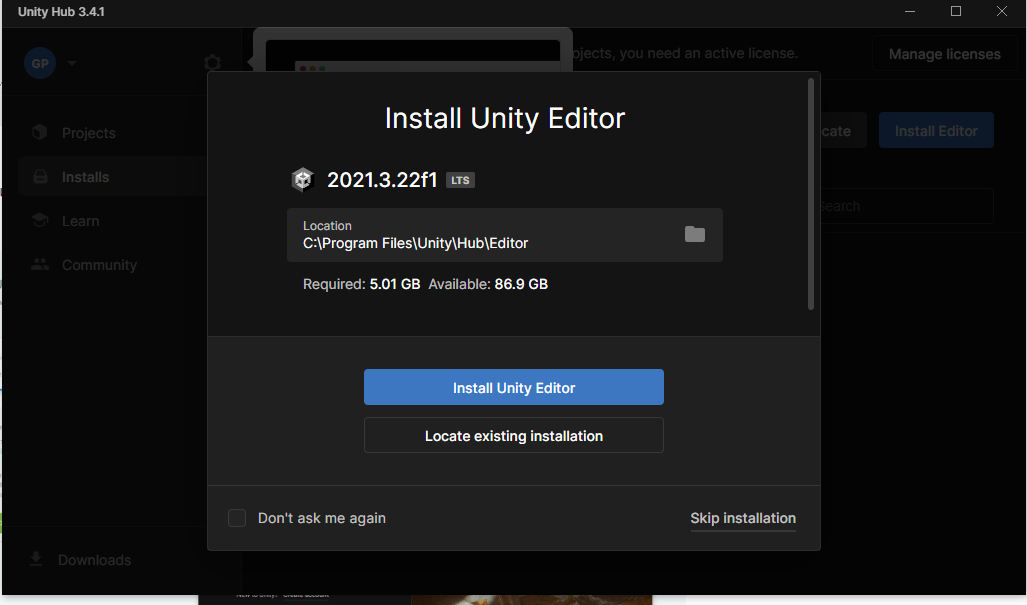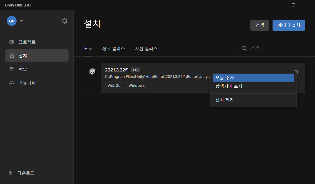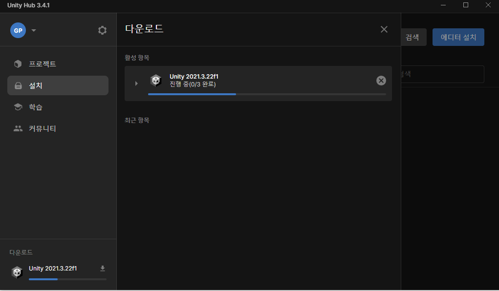 로그인을 하면 Unity Editor 를 설치하는 메시지가 나타납니다.
