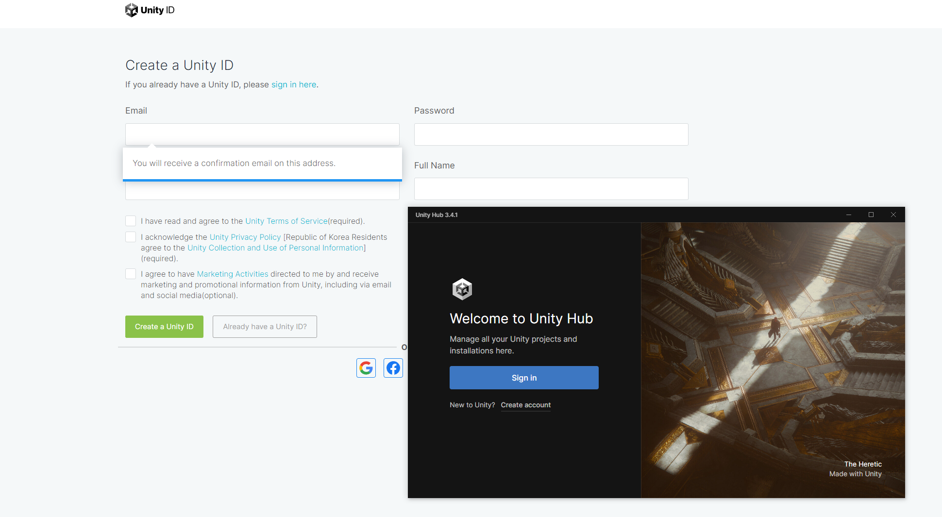 설치가 완료되면 Unity Hub를 실행하여 계정을 만들고 SIgn in 을 합니다.