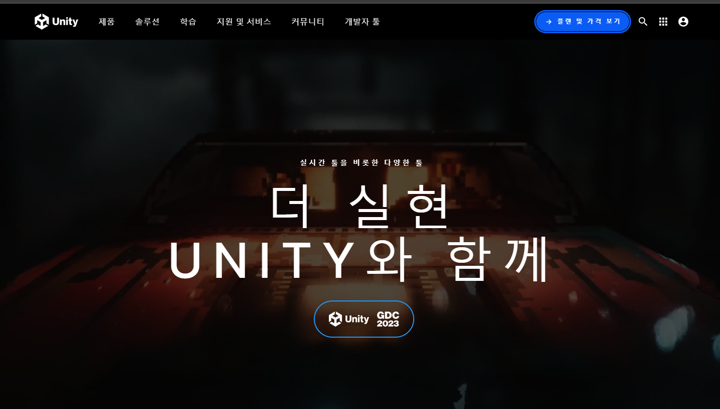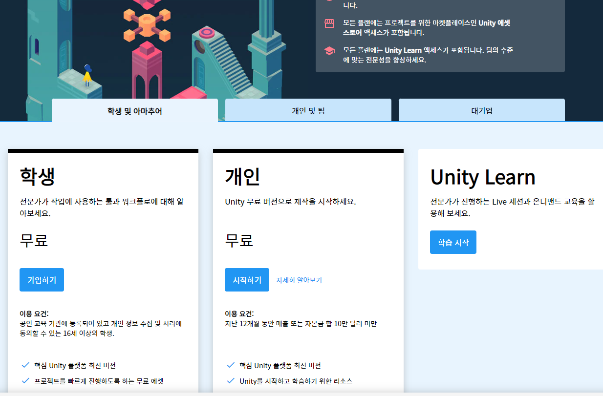 유니티는 무료인 ‘개인(학생, Personal)’과 유료인 ‘팀즈(Plus, Pro, 기업)’ 중에서 선택할 수 있습니다.