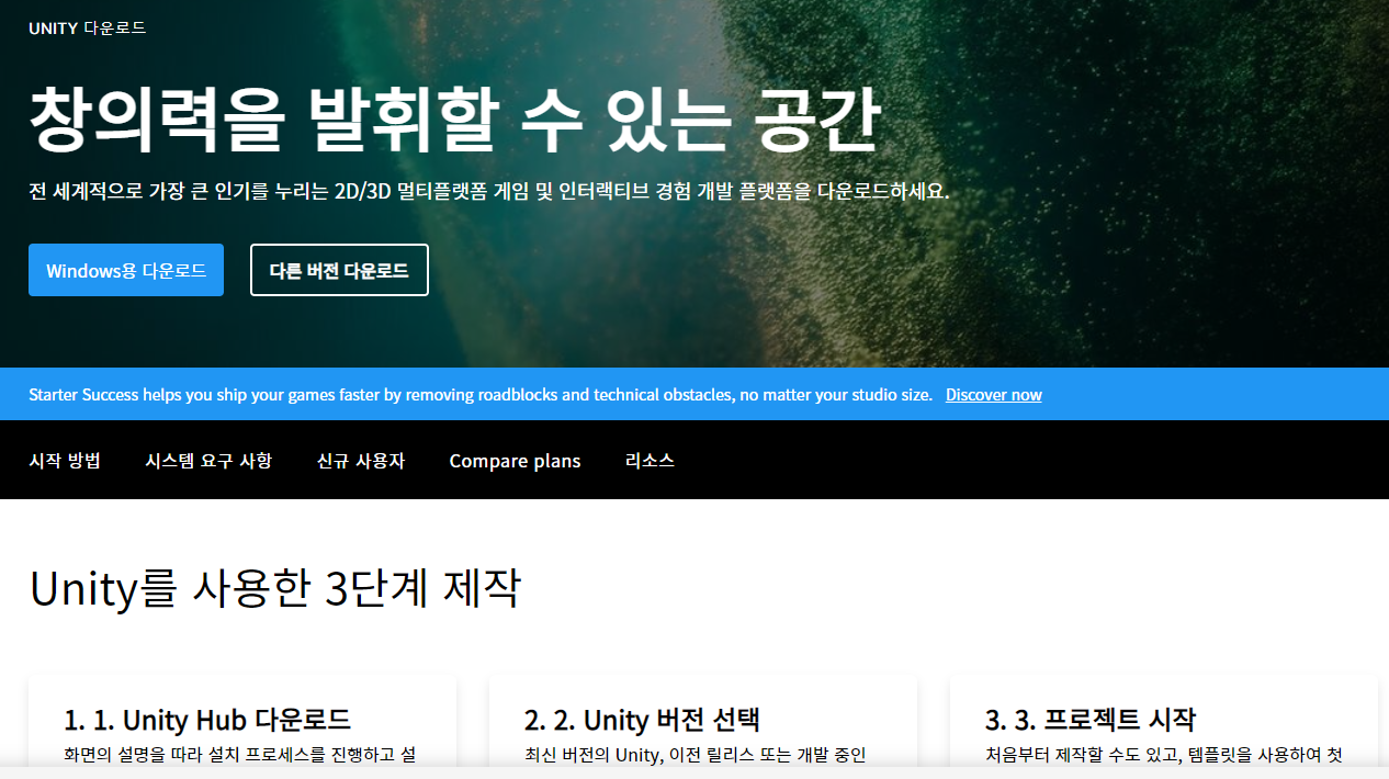 유니티를 사용하려면 (Windows용 다운로드)를 클릭하여 우선 유니티 허브(Unity Hub)라는 소프트웨어를 설치합니다.